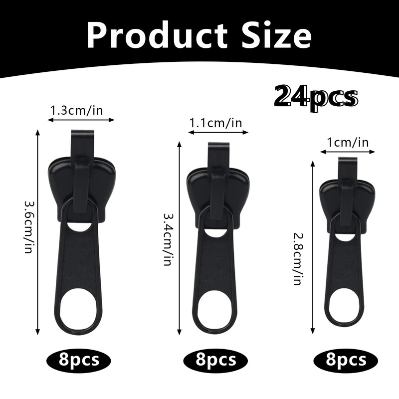 In the set: 24 clip-on zip pullers in 3 different sizes (0.5 inch to 1.1 inch): large, medium and small. Choose the right size for your specific replacement needs - enough for all your garments and accessories.