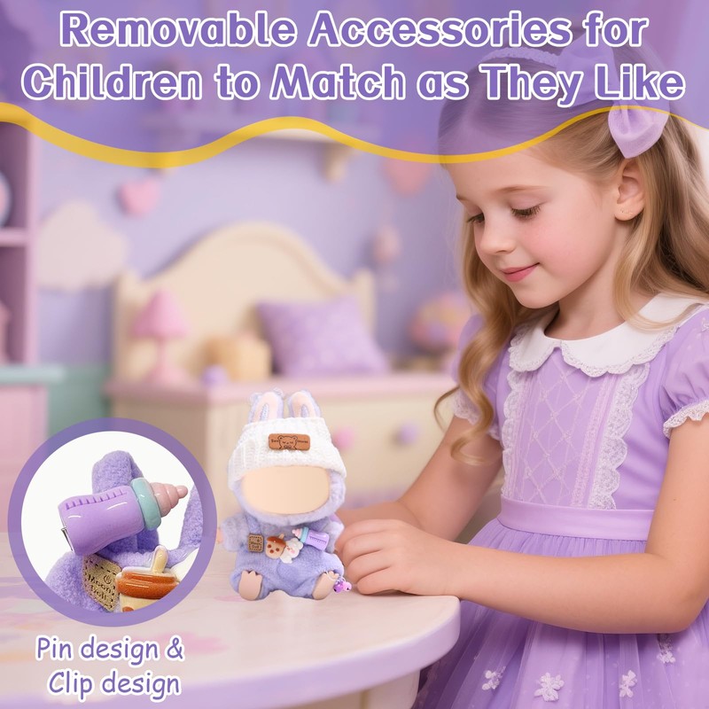 - Plush Doll Clothes Set Our cute doll clothes set includes 1 cute white bear hat, 1 purple bottle jumpsuit and 1 guitar pendant. The accessories are rich and exquisite and have a versatile style, making it an excellent choice for dressing up a 17 cm doll!