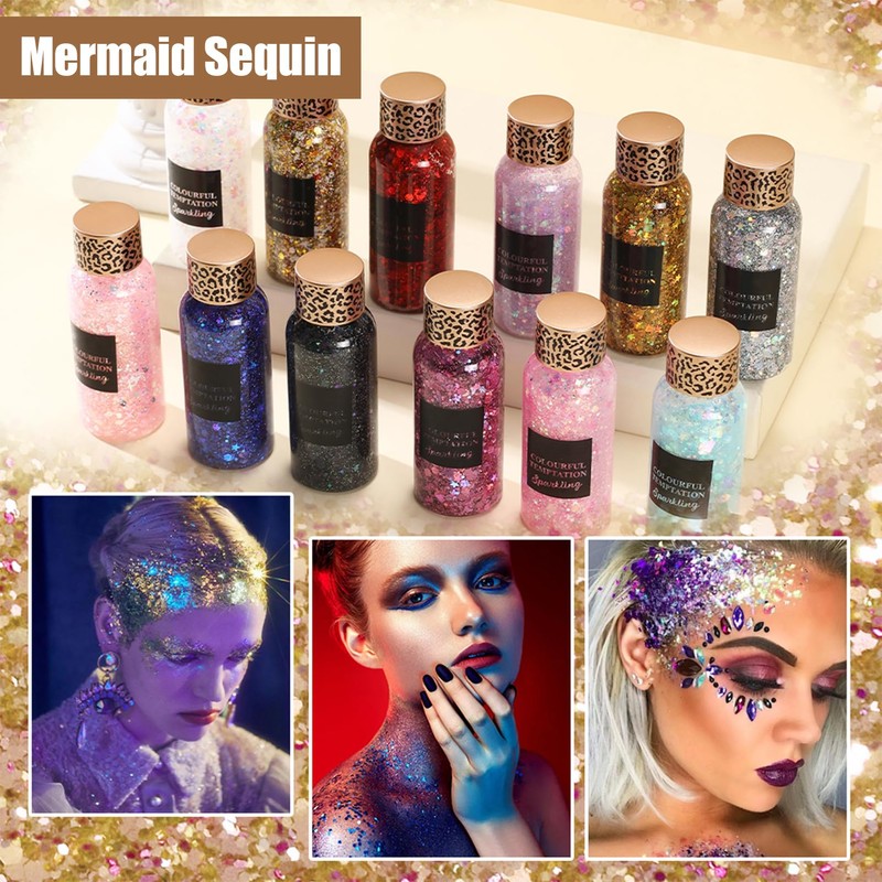 Pack of 3 Body Glitter Gel, Festival Glitter Face, Mermaid Chunky Sequins for Hair, Lips, Nails, Body Lotion Glitter Liquid Eyeshadow, Mermaid Sequins, Sparkling Party Make-Up Cosmetics