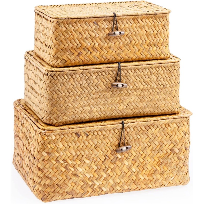 - Versatile Use These multifunctional seagrass baskets are suitable for storing snacks, skin care products, cat food, toys, books, socks and much more. They can be placed on shelves, in the kitchen, bathroom, on the vanity, in the TV cabinet, in the wardrobe or on the dresser. The seagrass storage baskets are the perfect versatile storage solution for any room in the home