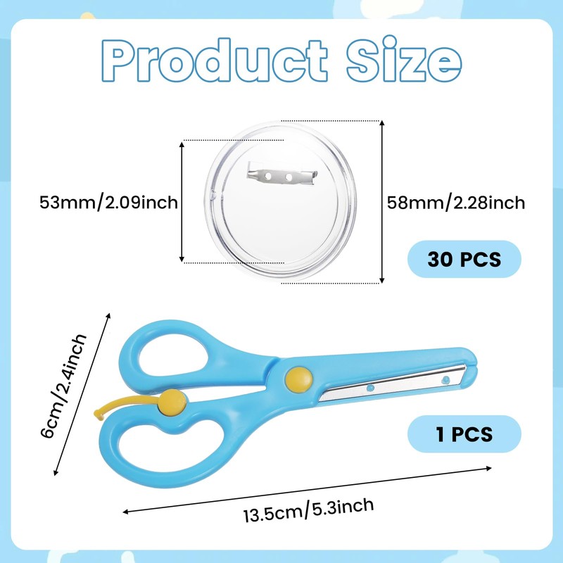Pack of 30 Buttons Badges Make Yourself, Transparent Acrylic Button Badge with Children Safety Scissors, Acrylic Button Pin Round Badge, Clear Button Pin Badge Kit for Crafts Supplies