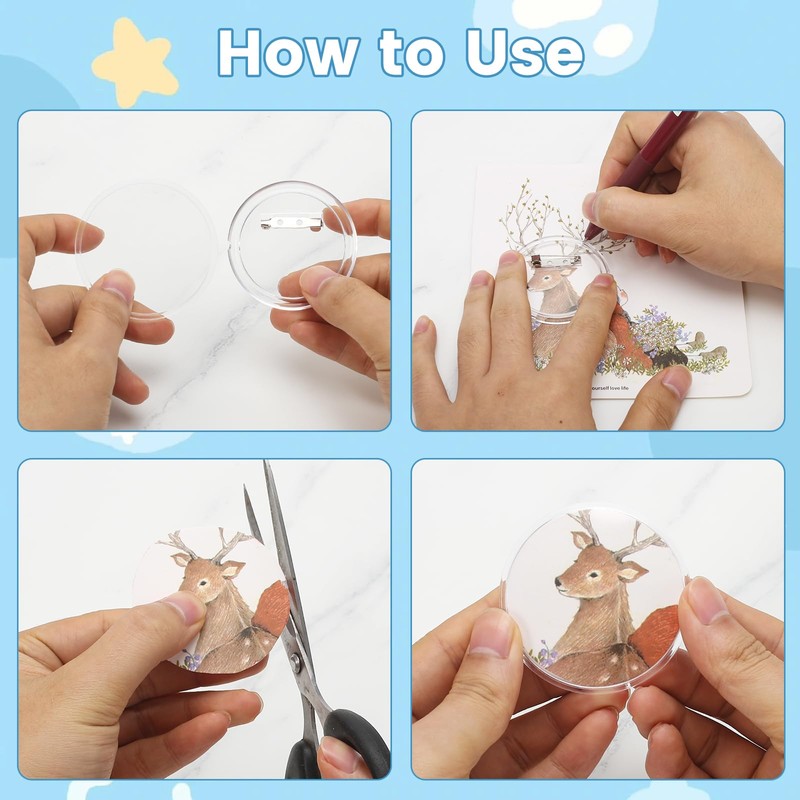 - Easy to use: transparent DIY badges can be assembled without a machine. Simply place the desired pattern between the two lids and press the front and back of the clear button pin badge kit firmly together with your hand.