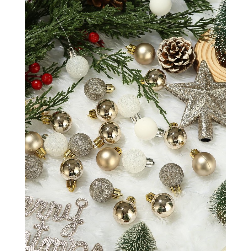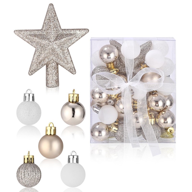- Mini Christmas Ball Set: the package includes 29 Christmas baubles and 1 golden star tree topper. The Christmas baubles have a diameter of approx. 3 cm and are available in 5 designs: matte gold, gold glittering spiral style, gold smooth, white matt, white glitter.