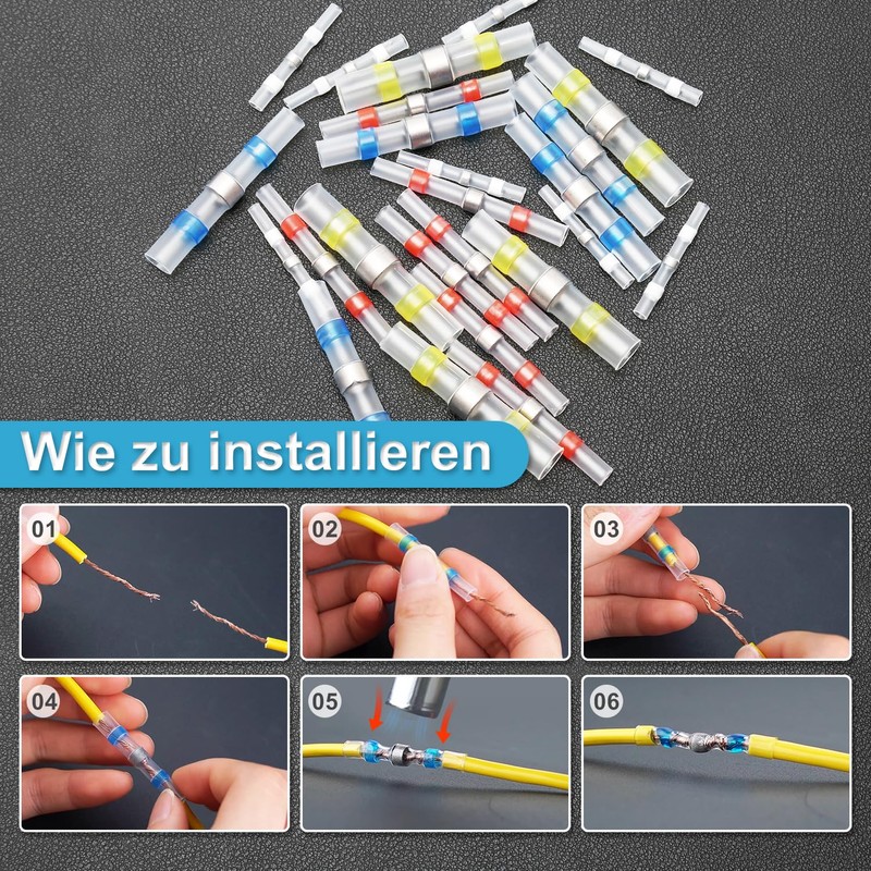- High-quality material: shrink connectors are advanced sealing with soldering and sealing technology, durable. When heated, the heat shrink tubing shrinks in a ratio of 3:1 to form a waterproof seal.