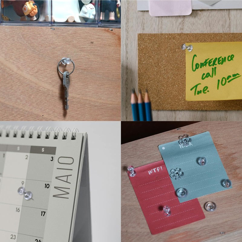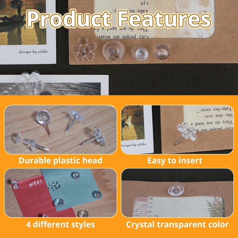 - Elegant design: the thumb tack appearance of this pushin is simple and stylish, with four exquisite shapes that make them look like decorations, and the transparent head that prevents them from blocking the display.