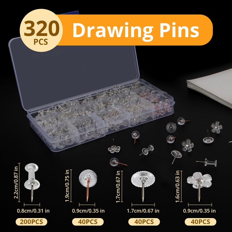 - Push pin set: you will receive 200 transparent push pins, 40 ball pins, 40 plum blossom pens, 40 gear pins, a total of 320 pens and 1 170 × 95 × 23 mm plastic box. The quantity is sufficient to meet your daily use.