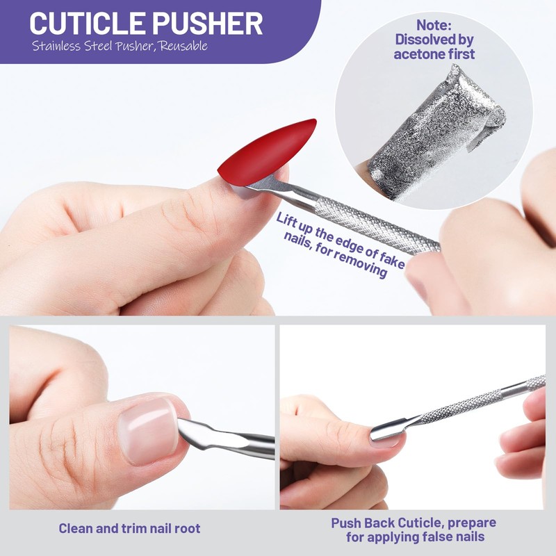 • Cuticle Pusher The curved flat end helps push back the cuticles flawlessly to prepare perfect nail modelling and gently remove residue from nail glue or nail polish. The sharp triangular end helps cut or scrape dead cuticles. Non-slip handle for painless care of cuticles. Made of stainless steel, durable
