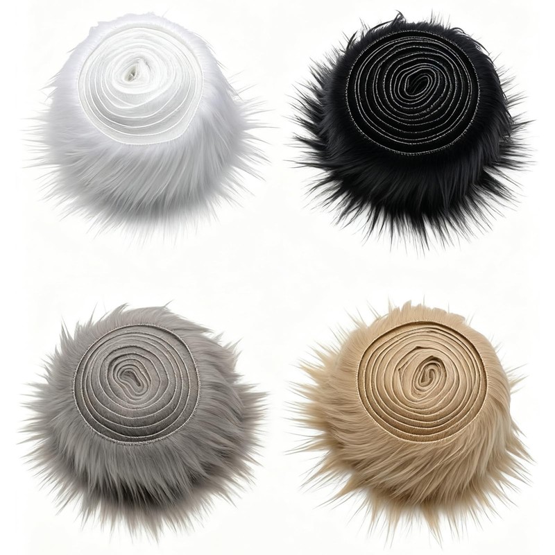 - Quantity and dimensions: 4 pieces faux fur fabric, sold by the metre, made of synthetic fur, usual size 5 x 150 cm, can be cut to size, 4 colours (Khaki, light grey, black, white)