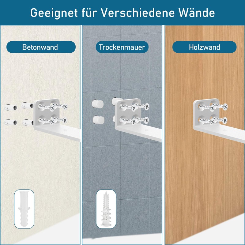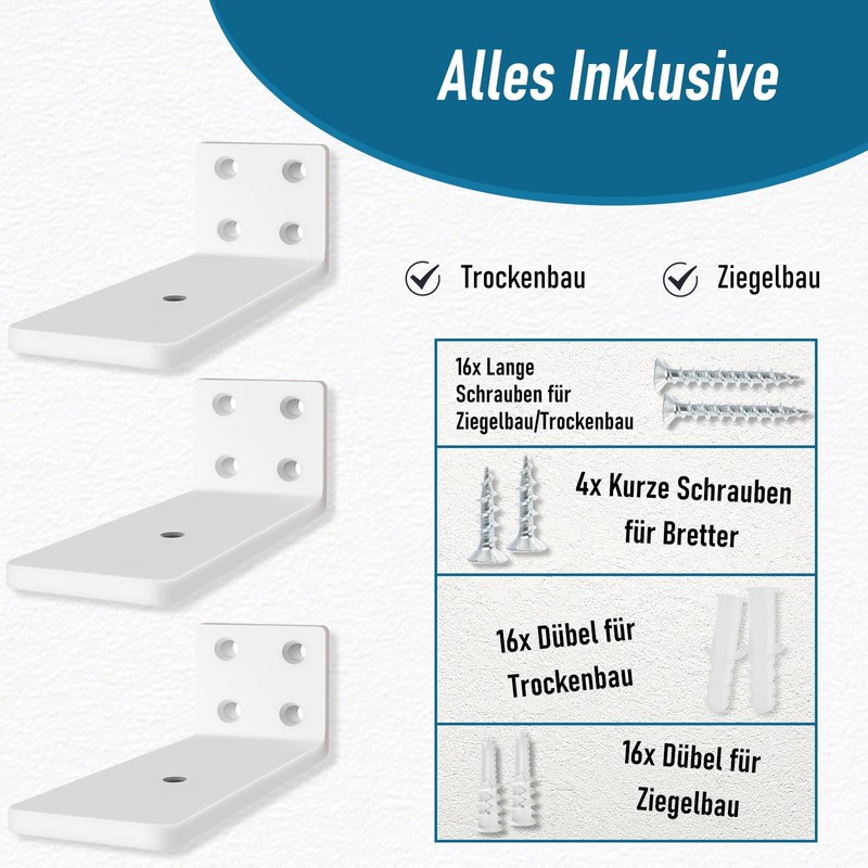 • Easy installation: our heavy duty shelf brackets & supports are equipped with the floating shelf mounting parts required for installation. Included are 4 brackets for floating shelf, 4 x short screws, 16 x long screws, 16 x drywall anchors, 16 x concrete anchors. No special skills are required to mount this wooden shelf bracket on the wall.