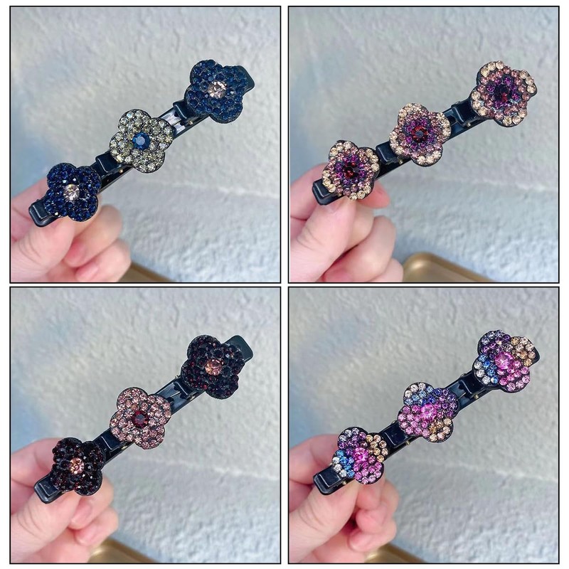 Pack of 4 Glittering Crystal Stone Braided Hair Clips, Hair Clips with Three Flowers, Fringe Clips, Hummingbird Hair Clip with Crystal Flower, Elegant Hair Styling Clips, Shiny Rhinestone Hair Clip