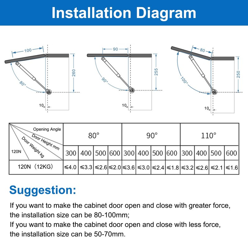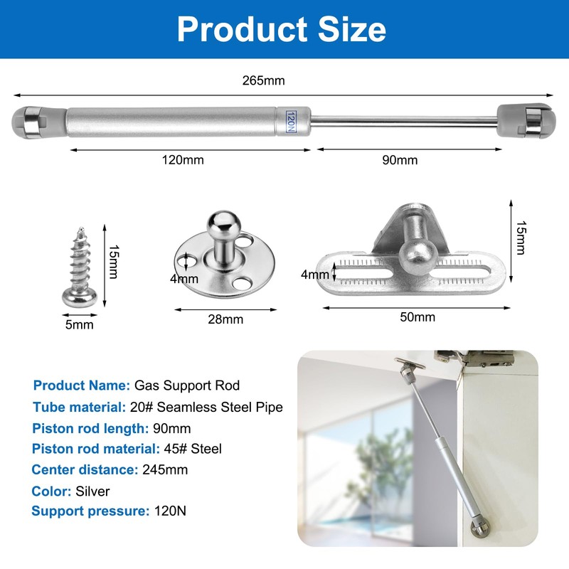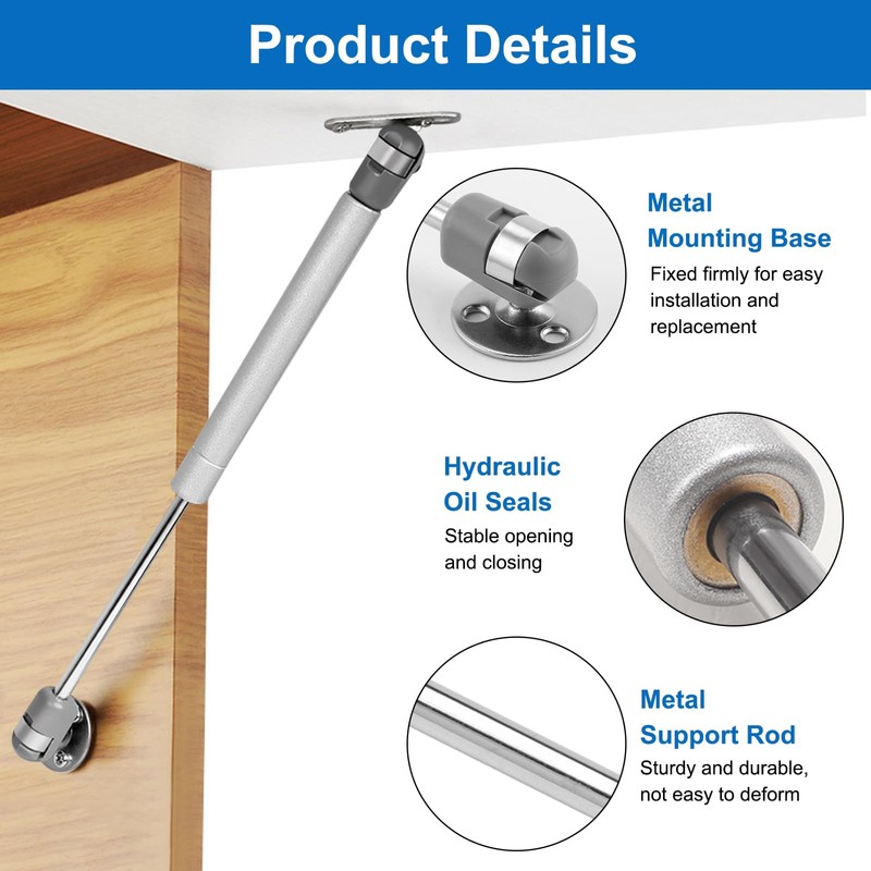 - Strong support, safe and stable: each gas lift can provide up to 120 N (12 kg) of support pressure. The piston cylinder uses inert gas - nitrogen, which is compressible, stable and safe. Our gas lift can stably support medium to large cabinet doors.