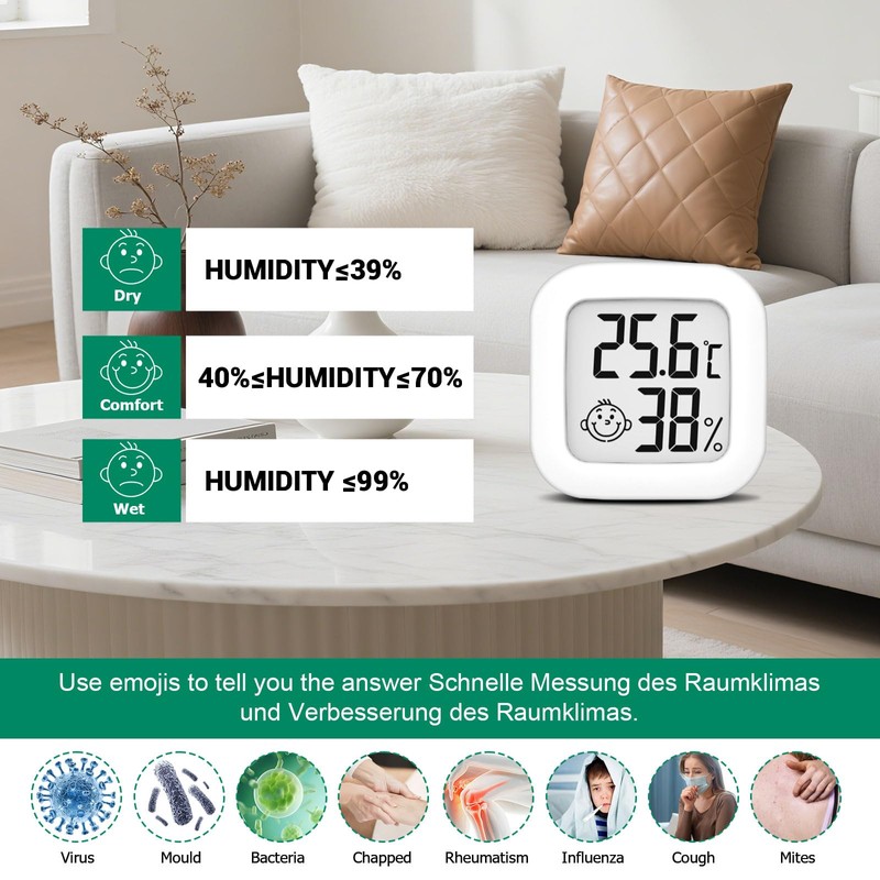 - Intelligent comfort display with switch: an integrated switch activates the mini hygrometer - at a humidity of 40% - 70%, a friendly smiley appears as a health indicator. If the value is below or above, an unfortunate symbol signals that the indoor climate is not ideal. Immediately understandable and stress-free reading.