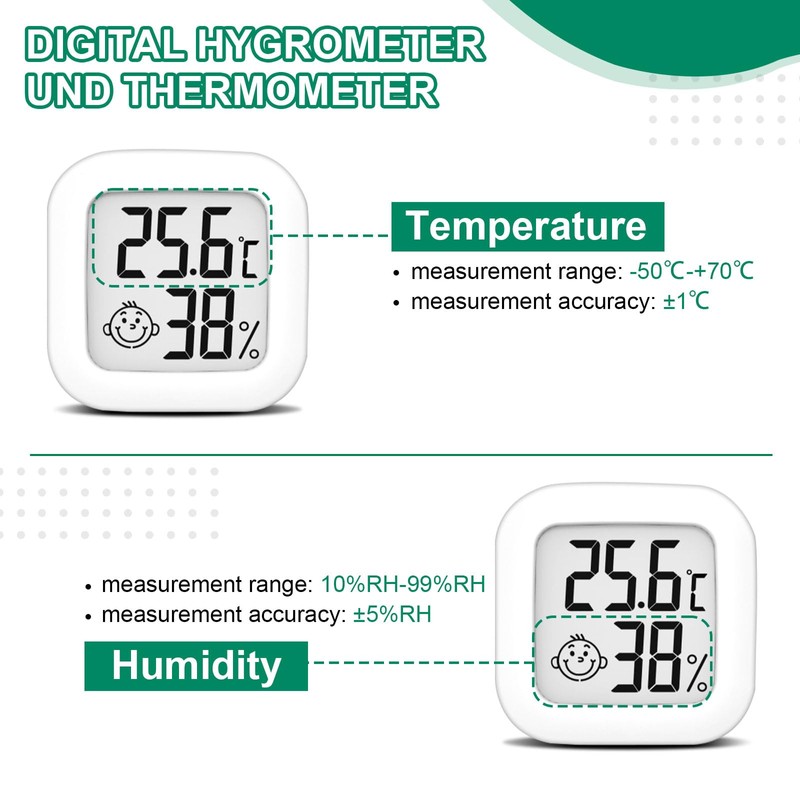 - Clear readable display: the large digit display clearly shows temperature and humidity - even from a greater distance. The face icons help you reduce stress and keep an eye on your indoor climate.