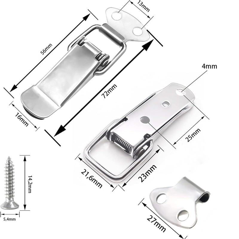 Pack of 4 Tension Clasps, 56 mm Stainless Steel Tension Lock with 16 Screws, Lever Lock, Snap Closure, Box Closure, Cap Lock, Box Lock for Doors and Cabinets