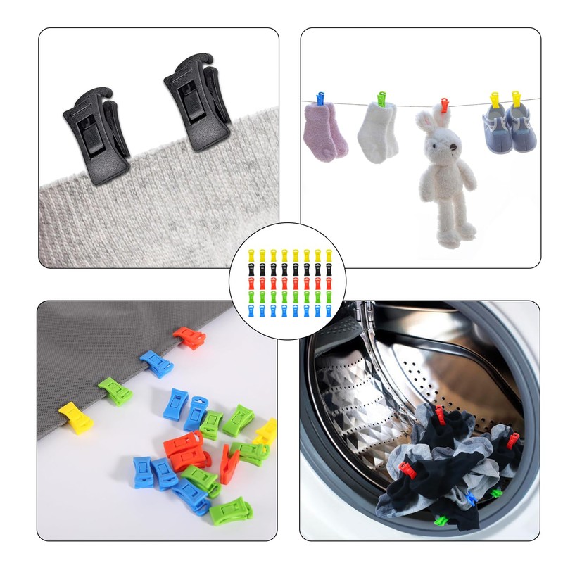 - These sock clips are suitable for all people who strive to improve their laundry organisation. They can be used in the washing machine to keep socks pairs together and prevent individual socks from disappearing. In the dryer, they also hold the socks firmly so they do not tangle. In addition, they can also be used as mini clothes pegs for small items of laundry or as an organiser in the laundry room.