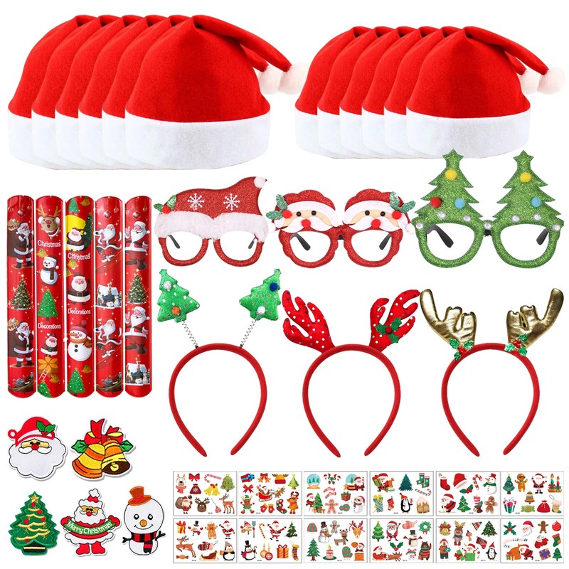 - 40 magnificent Christmas gifts: this Christmas set contains 12 Christmas hats, 12 tattoos, 3 Christmas glasses, 3 headband Christmas headband, 5 Christmas snap ring and 5 Christmas fibulae.