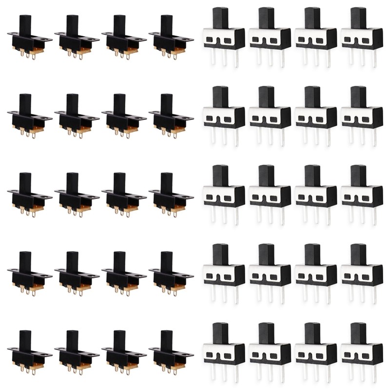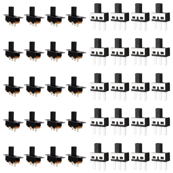 This set of 40 mini slide switches provides a solution for anyone who needs switches for their electronic projects. It includes 20 vertical slide switches (SS12D10) and 20 panel slide switches (SS12F15), both suitable for a variety of applications.