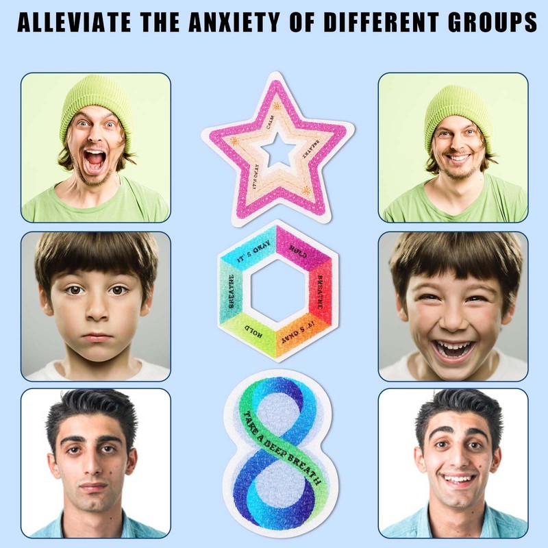 - Package contents: the set contains 6 stickers with different shapes and colours, 8 for each type, total 48. Just touch the rough surface with your fingertips to instantly relieve stress and anxiety, they help you stay calm and relaxed, and bring you a good mood all day long!