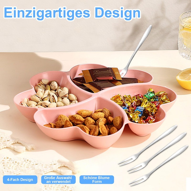 - 4-compartment design: snack bowl features a 4-compartment design. Each compartment can be used for different foods. This design not only ensures a clear and appealing presentation of the food, but also prevents the smell of different foods.
