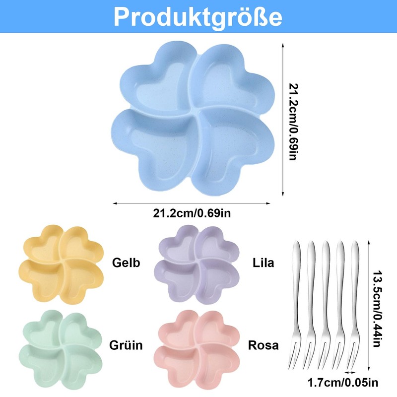 - Box contents: pack of 5 plates with dividers, size: 21.2 x 21.2 x 3 cm, blue/purple/green/yellow/pink. 5 pieces fruit forks, size 13.5 x 1.7 x 0.2 cm, equipped with fruit forks, let you enjoy delicious food and meet different eating needs