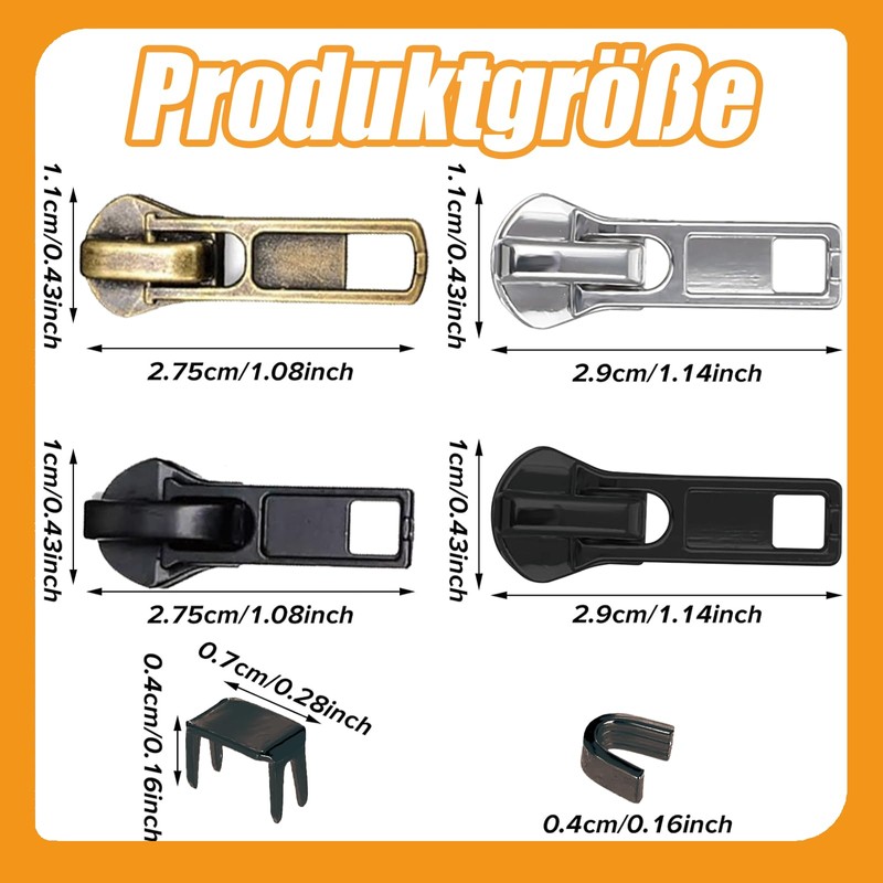 - Great value pack - The zip repair set contains 3 x black replacement zips for nylon zips, 3 x black replacement zips for plastic zips, 3 x silver replacement zips for metal zips, 3 x bronze replacement zips for metal zips, 24 x zip stopper at the top and 16 x zip stopper at the bottom.