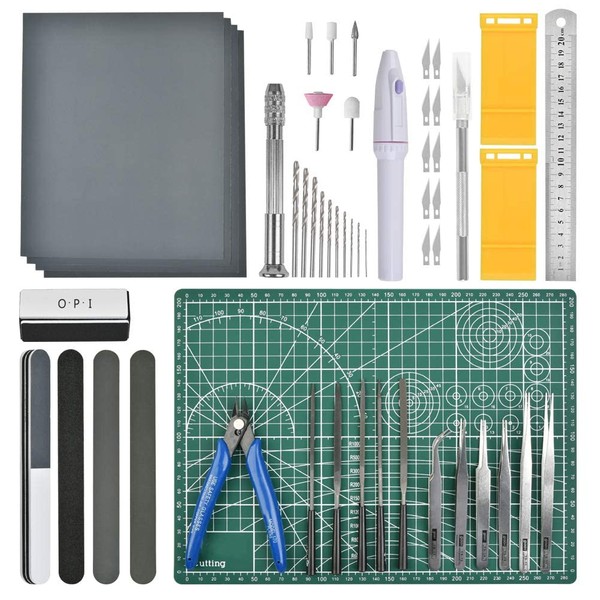 - ✅GUNPLA ACCESSORIES Our all-in-one kit contains everything you need to get started, including sandpaper, cutting mat, electric grinder, file, separator, steel ruler, polishing rod, tweezers, spring knife, side cutters, hand drill and power drill.