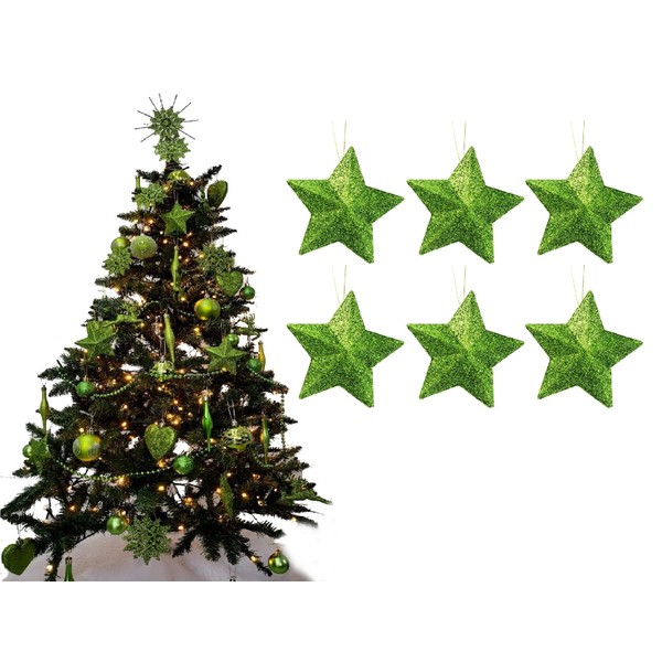 Pack of 6-8cm 3D Glitter Star Baubles Christmas Tree Decorations (Lime)