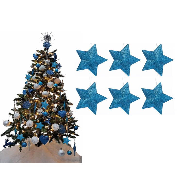 Pack of 6-8cm 3D Glitter Star Baubles Christmas Tree Decorations (Turquoise)