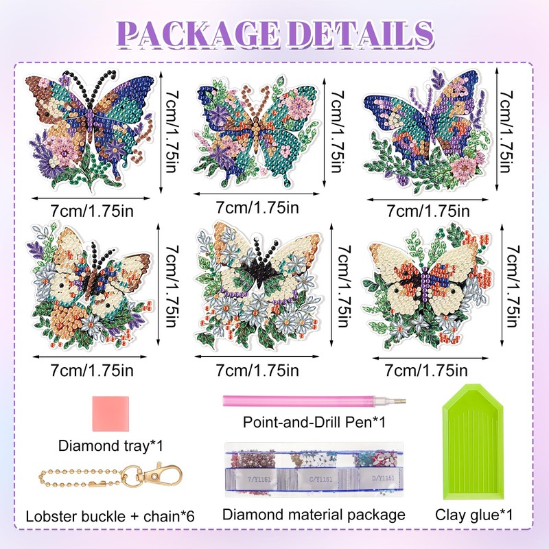 - - **Meet your decoration needs:** You will receive 6 pieces butterfly diamond painting keychain sets, including diamond painting pen, colourful gemstones, key ring, gemstone bowl and wax square, sufficient and diverse in styles and quantities, enough to meet your colourful creative ideas. The package contains all the necessary DIY tools that you can easily assemble yourself or with family and friends.