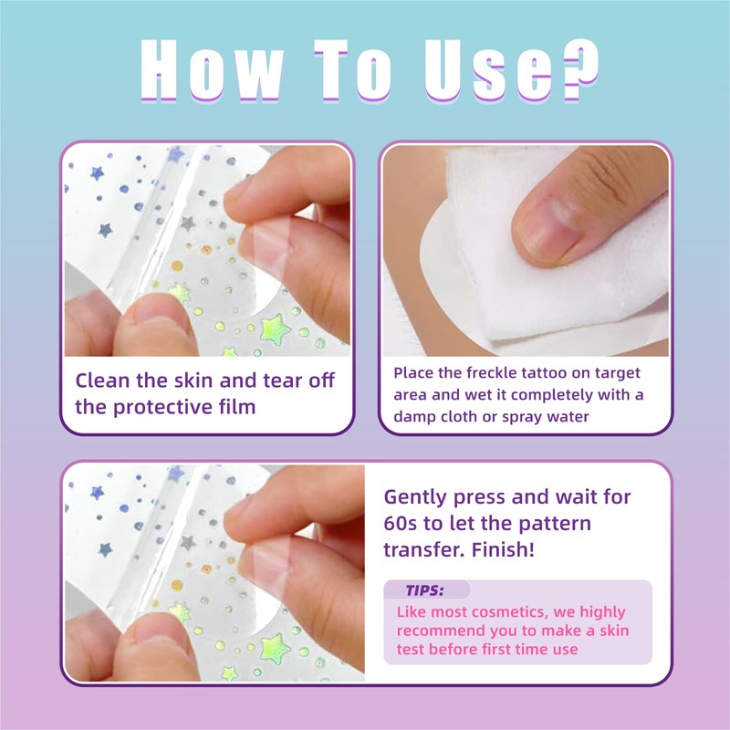 3. Long-lasting and waterproof: Our freckle tattoos are waterproof and sweat-proof, so they stay flawless all day. Whether at parties or other occasions, our glitter patches will make you look radiant.
