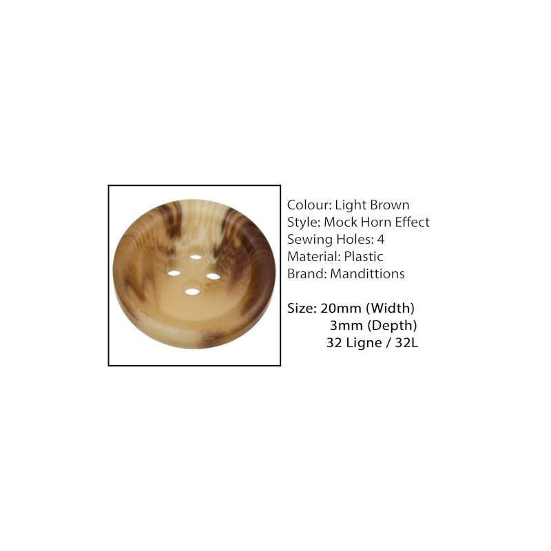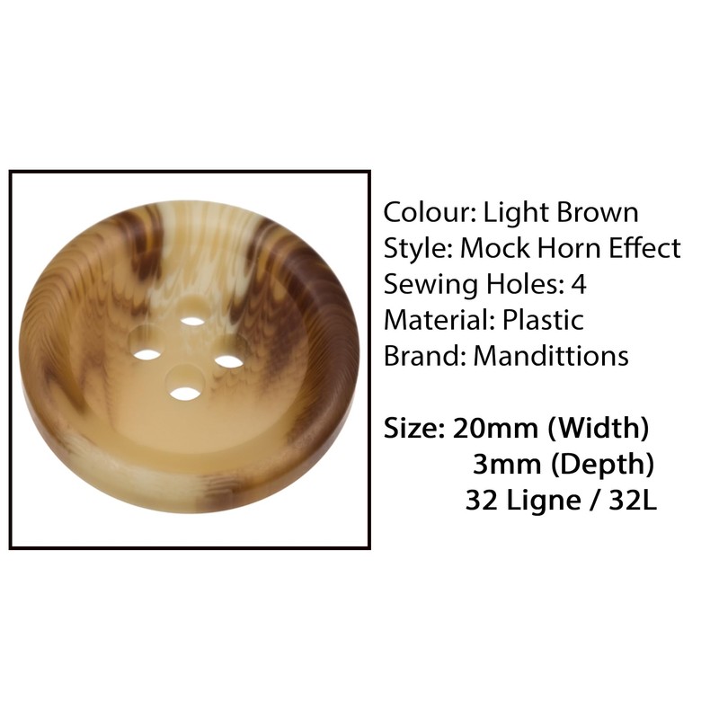 - Sold in packs of 6 or 12. These 20mm buttons mimic the elegant and natural horn effect with the slight colour variations throughout the buttons ranging from dark to lighter shades of each colour and offer a touch of sophistication to your garments.