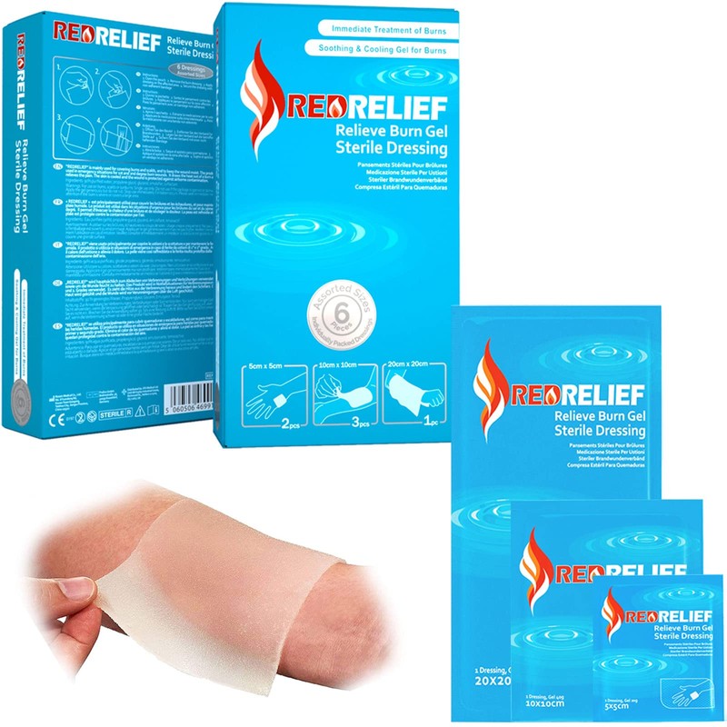 Pack of 6 RedRelief Emergency Assorted Burn Dressings - Cools, soothes and relieves Pain