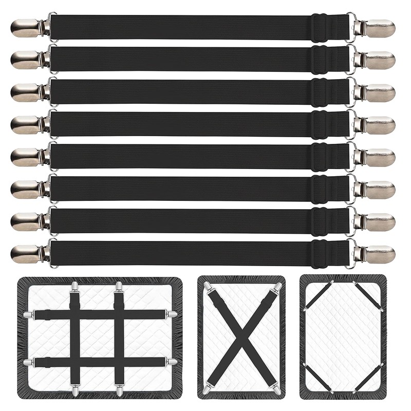 These clips are suitable for sheets, mattress covers, sofa covers, tablecloths, cots, benches, car seat covers, ironing board.