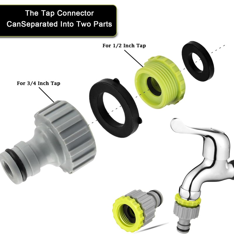 - Garden tap connection hose connection: the quick coupling is suitable for a 1/2 inch water hose and can be installed and removed by simply pressing and pulling down. The 2-in-1 tap connection consists of two parts, a green and a grey, the grey part matches the 3/4 inch tap and the green part to the 1/2 inch tap. You can use it together or separately as needed