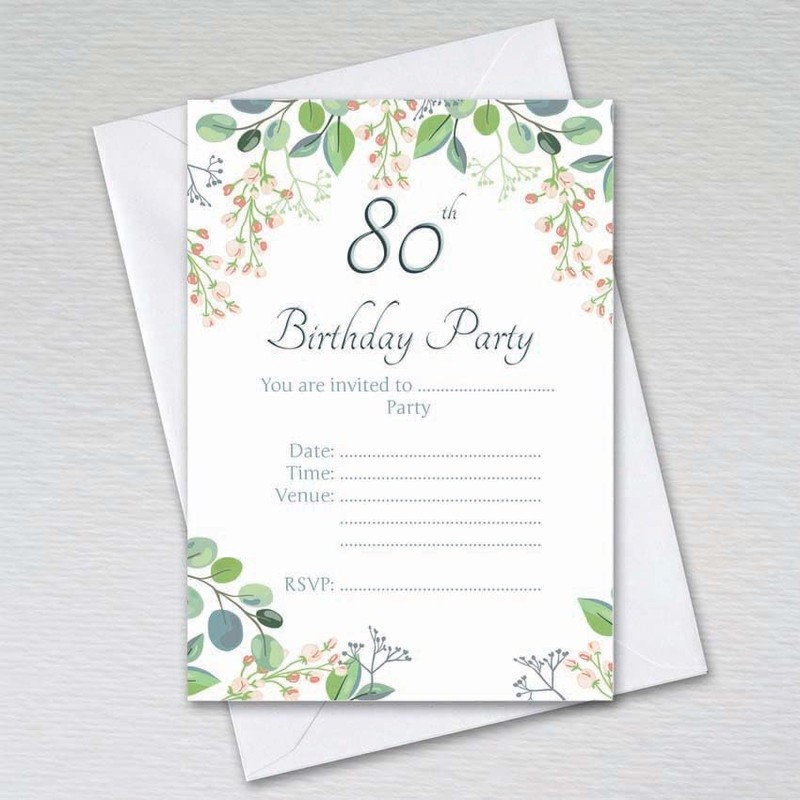 - Pack of 80th Birthday Party Invitations with a stunning Eucalyptus design.