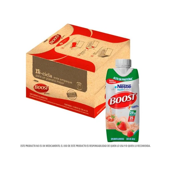 Suplemento alimenticio con sabor a fresa y alto contenido de proteína. Se sugiere consumir una porción de 330 ml al día. Agitar bien antes de consumir. Para una mejor experiencia, se aconseja tomarlo frío. No se debe congelar. Una vez abierto, se debe refrigerar y consumir en las siguientes 24 horas. Contiene Soya y Leche. Posible presencia de Almendra y Gluten.