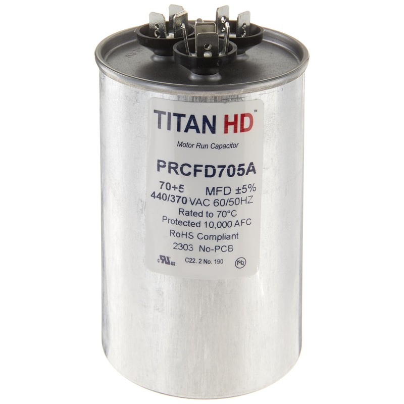 - Capacitor Voltage: 440/370, Run MFD: 70+5, Capacitor Shape: Round, Brand: Titan HD, Can /Case Size: 15, Country of Origin: USA, Diameter (In.): 2.5, Hertz: 50/60, Material: Aluminum Can, Oil Type: Soybean Based, Operating Temperature Range: -40 to 70, Terminals: Standard blade terminals, Tolerance: +/- 5%, UPC: 840899103020, Voltage: 440/370