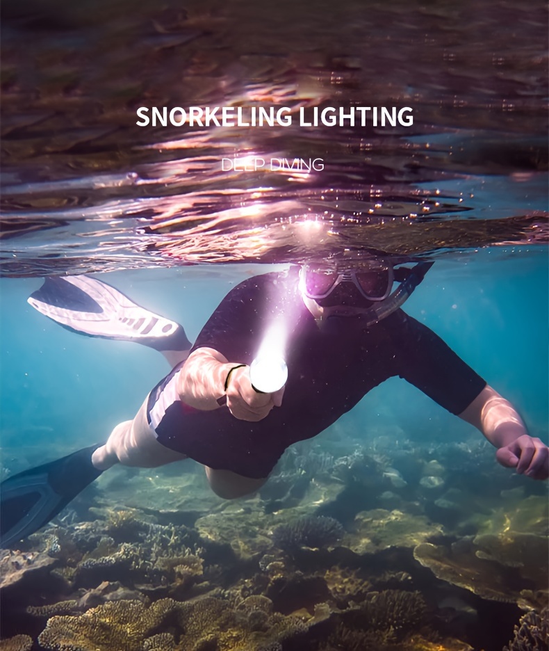 A newly designed two-tone yellow and white wick, featuring strong penetration and an extended lighting range, with a unique deep focusing reflector that provides concentrated light and powerful penetration, achieving a maximum brightness of 3800lm and offering 2 lighting modes. Ideal for fishing and snorkeling.