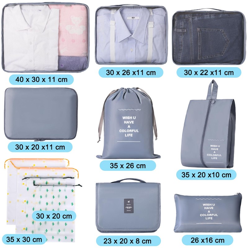 - 【12 Pcs Upgraded Packing Cubes Set】- This set include 3 travel packing cubes with mesh top for clothes, 1 private cubes for nightclothes and underwear, 1 shoe bag, 1 upgraded toiletry bag, 1 travel laundry bag and 4 clear PE drawstring bags for dirty clothes or socks, 1 flat zipper bag for sundries, like electronic accessories or keys, etc. These fit nicely inside regular suitcases and carry all your belongings on travel.