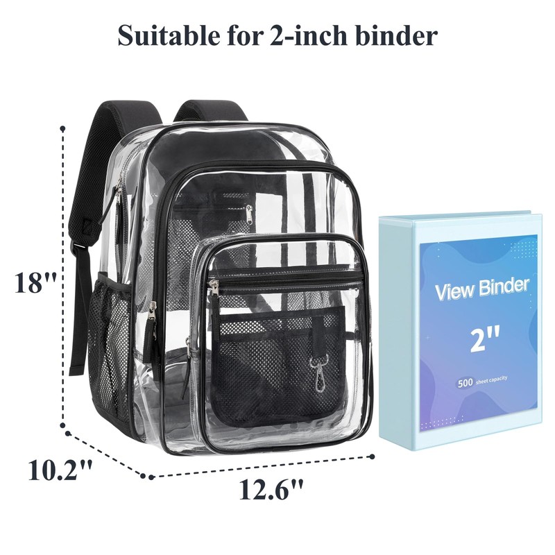 - 7 Pockets for Smart Organization: Extra large 18" size, this transparent backpack offers increased storage capacity suitable for a range of school essentials. It consists of 2 compartments: a main section and a dedicated laptop compartment that fits devices up to 17". The backpack's dimensions are 18" x 12.6" x 10.2", and it includes 1 front pocket and 2 side mesh pouches, ensuring everything remains organized and easily accessible. Ideal for students who require extra space and organization