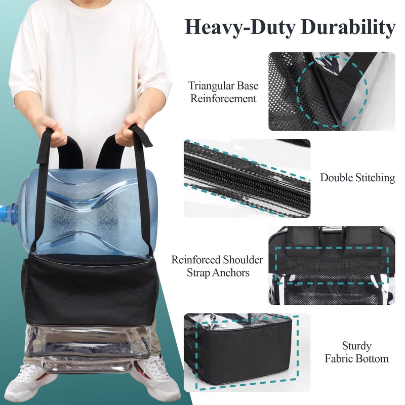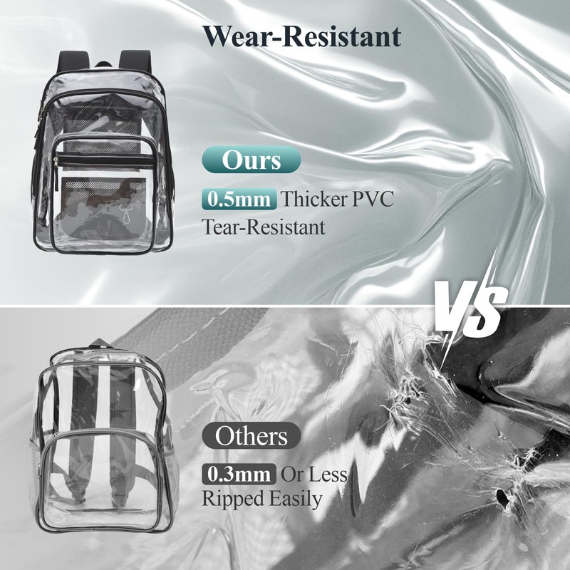 - Built Tough for Daily Use: Made with 0.5mm thick PVC, reinforced stitching, and sturdy zippers, this clear backpack heavy duty handles daily wear and tear. Supports up to 33 lbs (15 kg) and features a reinforced bottom for extra durability. Plus, it is rigorously tested and certified to meet strict CPSC safety standards