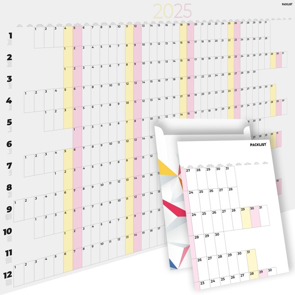 - Package and dimensions – The PACKLIST wall calendar 2025 comes folded in a C4 envelope and has a large poster size of A1 850 x 570 mm when unfolded