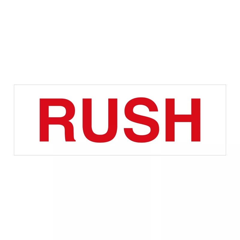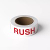 Pre-Printed tape for use with cartons and boxes. Graphic says "RUSH" Red image with white background.