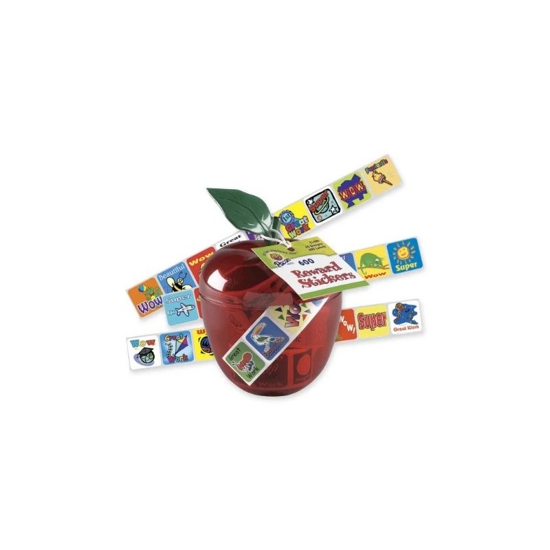 Product DescriptionThis item is brand-new, factory sealed. Bright, shiny red plastic apple stores three rolls of assorted message reward stickers. Illustration: Reward; Color(s): Assorted; Width: 1; Height: 1.(600) Stickers, (45) Different Designs Global Product Type:Stickers-Educator Stickers Specification