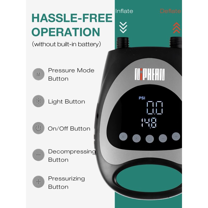 - 【Elevate Your Beach Days】: Revolutionize your outdoor adventures with Niphean air pump(NO BUILT-IN BATTERY). Engineered with dual ports for seamless inflation and deflation, Niphean portable inflator pump ensures convenient setup and storage of your inflatables. Say goodbye to wasting precious time on preparation and hello to more quality moments on the water. Our sup air pump effortlessly inflates your paddle board in just minutes, reaching a maximum of 20PSI.