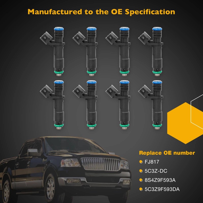 l 【Replace OE Number】FJ817 5C3Z-DC 8S4Z9F593A 5C3Z9F593DA. The injectors have undergone rigorous simulation tests to detect leakage, blocking, atomization, injection angle and the uniformity of each nozzle at different speeds, to guarantee long-term dependability.