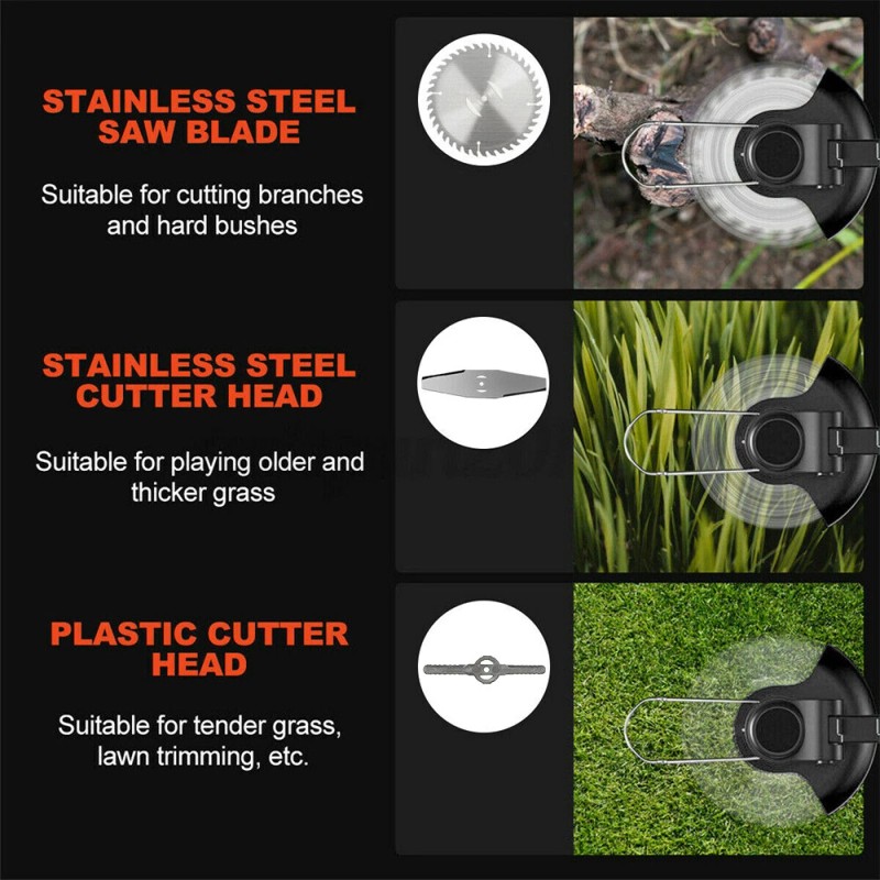 👍【Lawn Trimmer Tool with Functional Blades】The electric weed eater equipment with 3 types of blades - manganese steel circular saw blades for cutting thicker shrubs, branches;stainless steel metal blades for cutting thick weed & small shrubs;Plastic blade, suitable for cutting young grass.Different types of blades are suitable for different trimming sites to meet your daily trimming needs