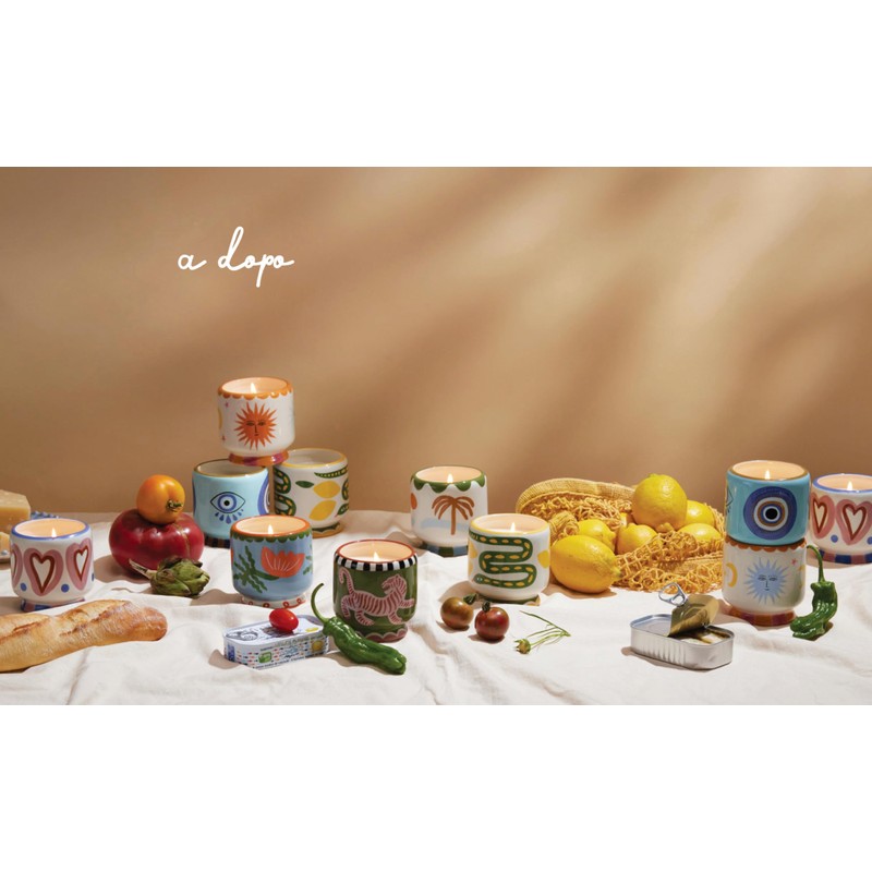 - A DOPO SCENTED CANDLE Inspired by the colors and patterns of Morocco, the A Dopo candle collection features ceramic footed pots with hand-painted details and hand drawn dust covers