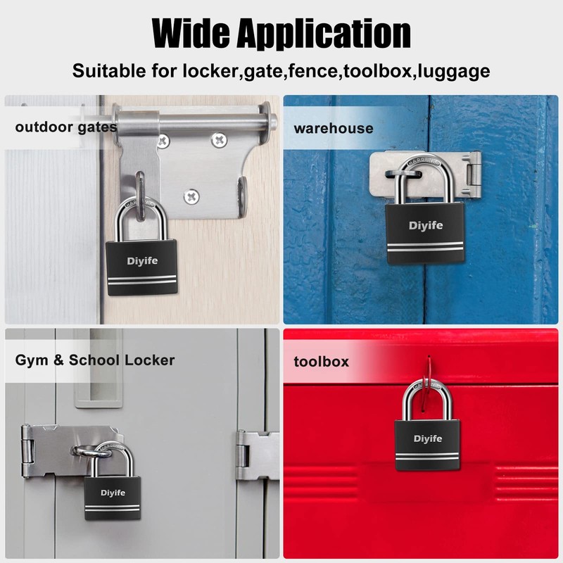- 【Waterproof and Rust-proof】Pure copper lock cylinder, aluminium lock body, Black vinyl-covered. With excellent waterproof and anti-rust performance, no metal burrs, will not stab your skin. Diyife key padlock can effectively protect the interior from moisture, suitable for indoor and outdoor use