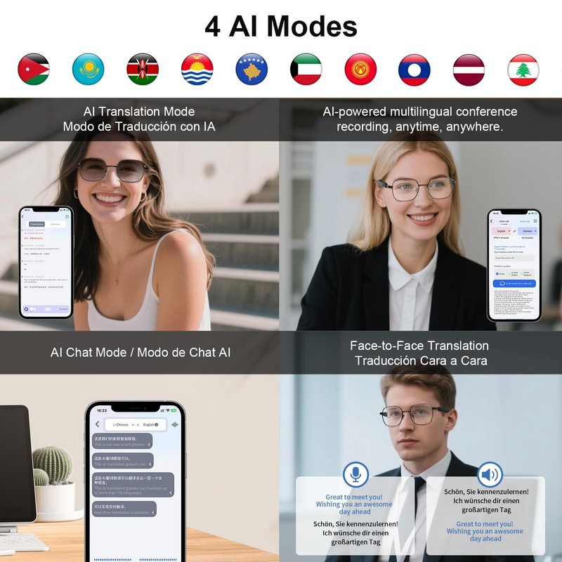 - 【Multi-Mode Translation Suite】These smart AI glasses for men & women can break down language barriers with simultaneous interpretation, face-to-face translation, and live recording across 115+ languages. Ideal for international travel, business meetings, or language learning—capture conversations effortlessly and review recordings later via the app.